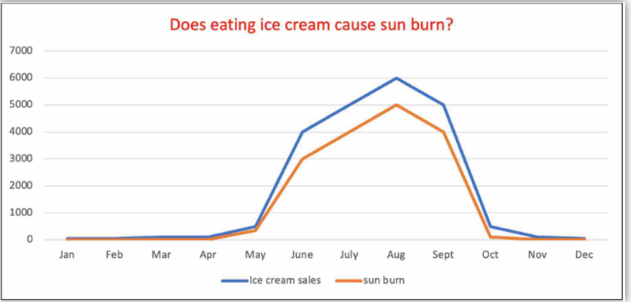 The increases in ice cream sales correspond with increases in sun burn but this is correlation not causation - both just happen to occur in summer or hot weather.