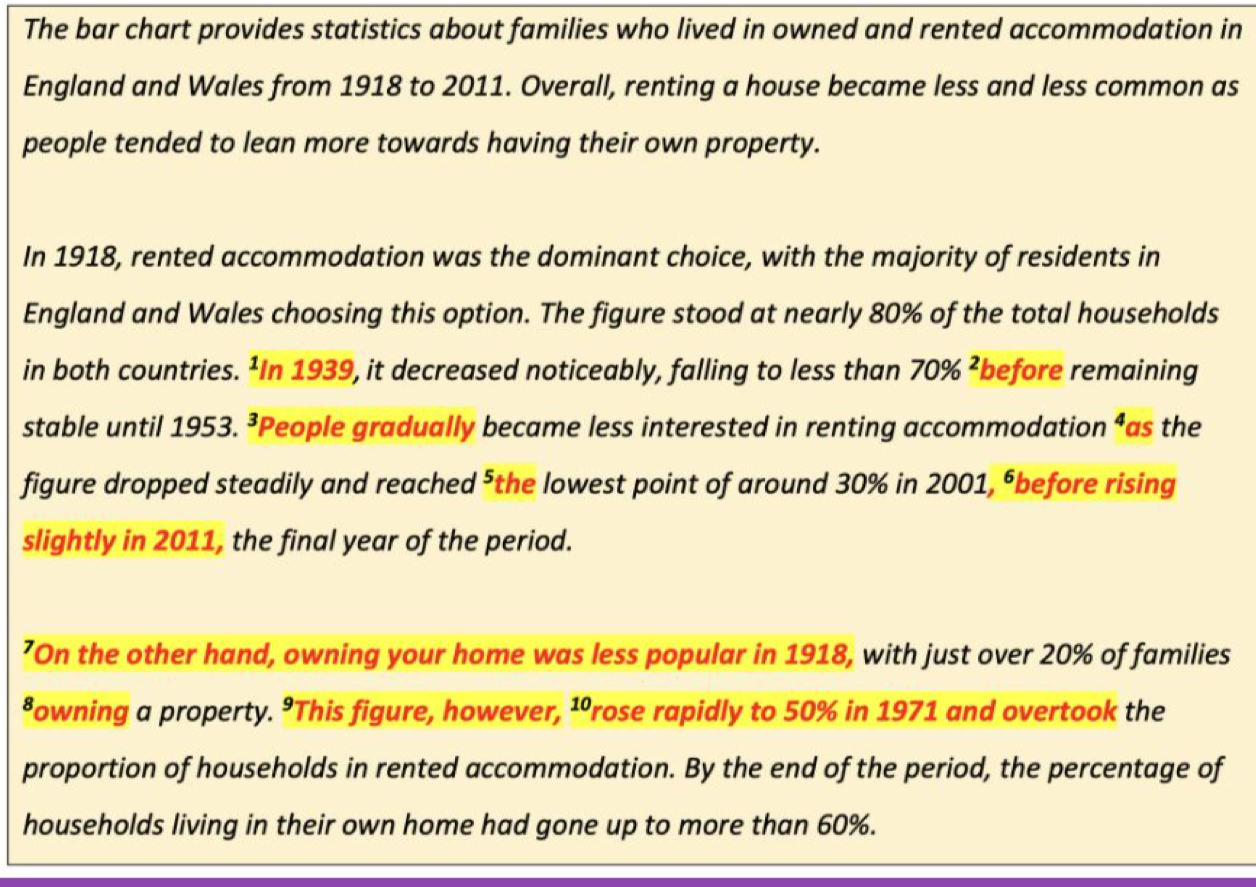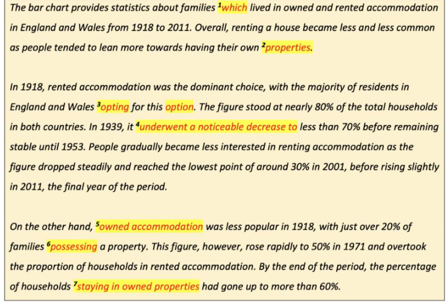Consider also that, if we rent a property, someone owns it. The wording in the question and the chart is a little unhelpful here as it refers to ‘owned accommodation’ and ‘rented accommodation’. This works with ‘accommodation’ as the context is clear. But people are often tempted to write ‘living in an owned house / property’, which does not work. We need to write ‘the percentage of people living in their own home’ not ‘living in an owned home’