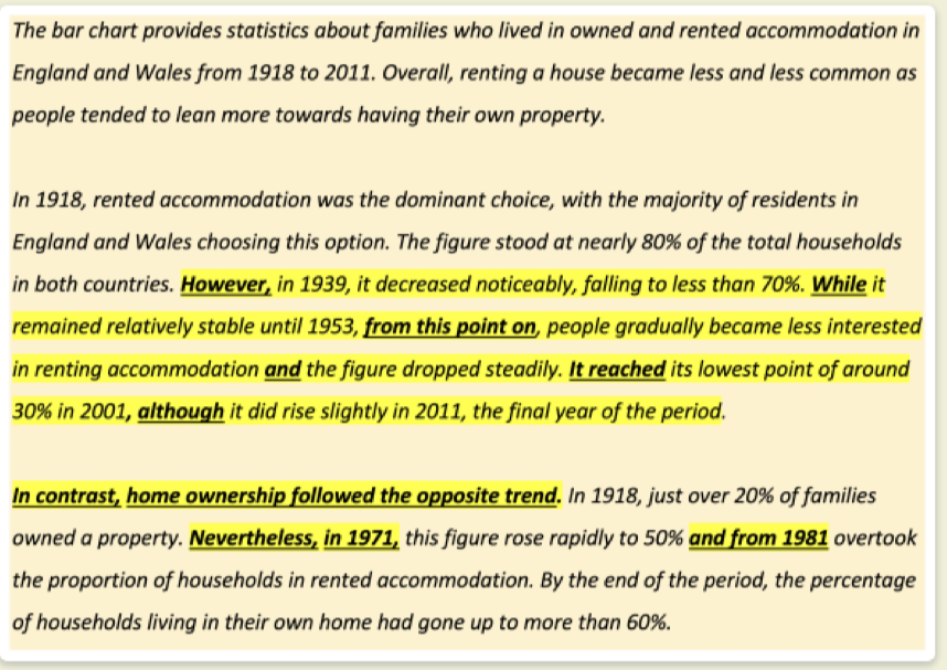 We need to present clear, logical evidence to support the points we make. The same idea applies in writing task 1. IF we make a statement such as ‘more and more resident moved out of rented accommodation’, then we need to be sure we can supply evidence from the data we are given to support this. If there is no evidence in the data about people moving house, then the statement is not relevant to the task.