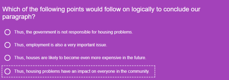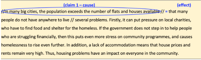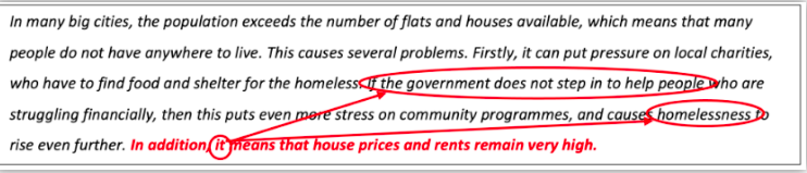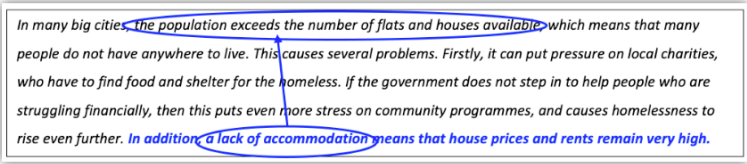 At the moment, our paragraph is quite short. However, if we want to add another negative effect resulting from a lack of housing, we need to be very careful. A common mistake at band 6 is to simply add a new idea, like the final sentence in this extract: