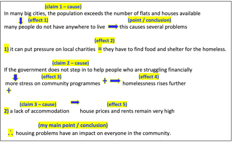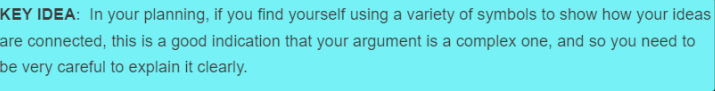 As this image shows, this is a very complex argument. It combines arguing by showing cause and effect, arguing by showing contrast, and arguing by adding information. Because of this complexity, there is a greater chance of language errors, and it is particularly difficult to explain the progression of the argument clearly and simply. When planning, we need to be aware of how complex our argument is before begin writing so that we can take extra care when connecting our ides, particularly when referring back to a much earlier idea.